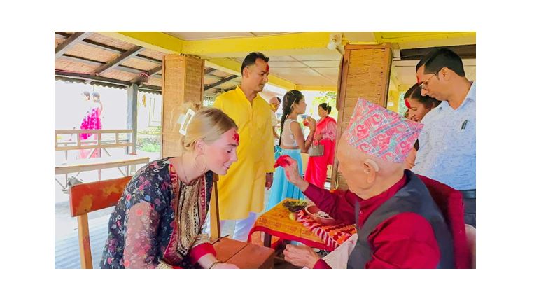 मुग्लिन : चितवनको पर्यटकीय नगरी सौराहा घुम्न आएका विदेशी पर्यटकले दसैँ मनाएका छन् । हिन्दुहरूको विशेष चाड बडादसैँमा नेपाली संस्कृतिको बारेमा बुझ्दै विदेशी पर्यटकले सौराहाको होटल सपना भिलेजमा टीका र जमरा थाप्दै दसैँ मनाएका हुन् ।