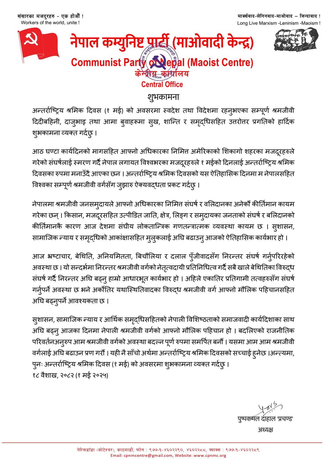 सन्देशको अन्त्यमा अध्यक्ष प्रचण्डले पुनः अन्तर्राष्ट्रिय श्रमिक दिवस (१ मई) २०२५ को अवसरमा शुभकामना व्यक्त गरेका छन्।