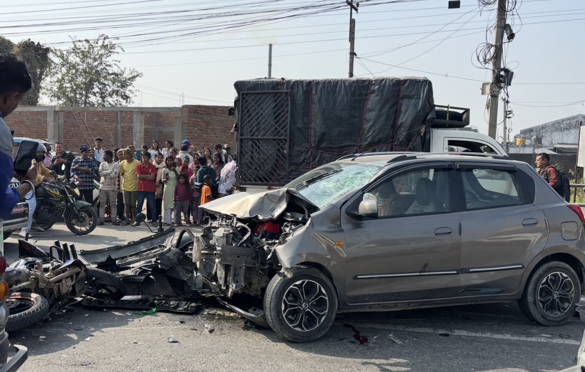 ईटहरी, पौष ४ । ईटहरीस्थित सोनापुर जुट मिल नजिक आज ठुलो सवारी दुर्घटना भएको छ । दुई वटा मोटरसाइकल एकआपसमा ठक्कर खाँदा पछाडिबाट आइरहेको एउटा कार समेत अनियन्त्रित भई ठोक्किएको हो ।