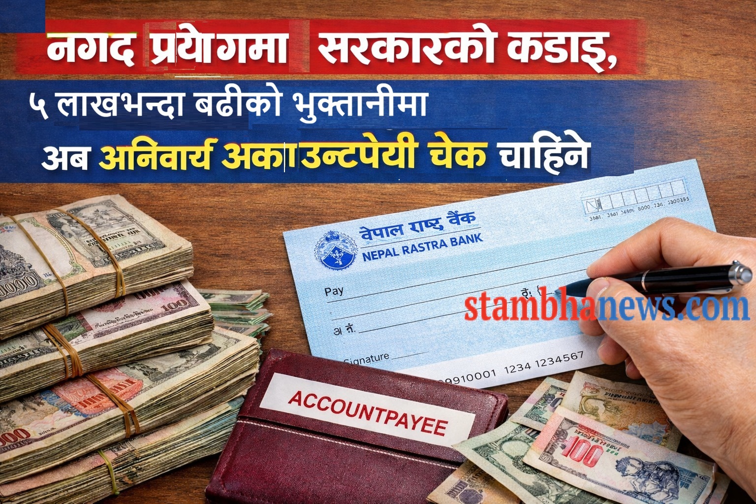 काठमाडौं । सरकारले नगद कारोबारमा कडाइ गरेको छ । ५ लाख रुपैयाँभन्दा बढीको भुक्तानी अब नगदमा गर्न नपाइने भएको छ । सोभन्दा बढी रकमको भुक्तानी गर्दा अनिवार्य रूपमा अकाउन्टपेयी चेक वा बैंकिङ माध्यम प्रयोग गर्नुपर्ने व्यवस्था गरिएको हो ।