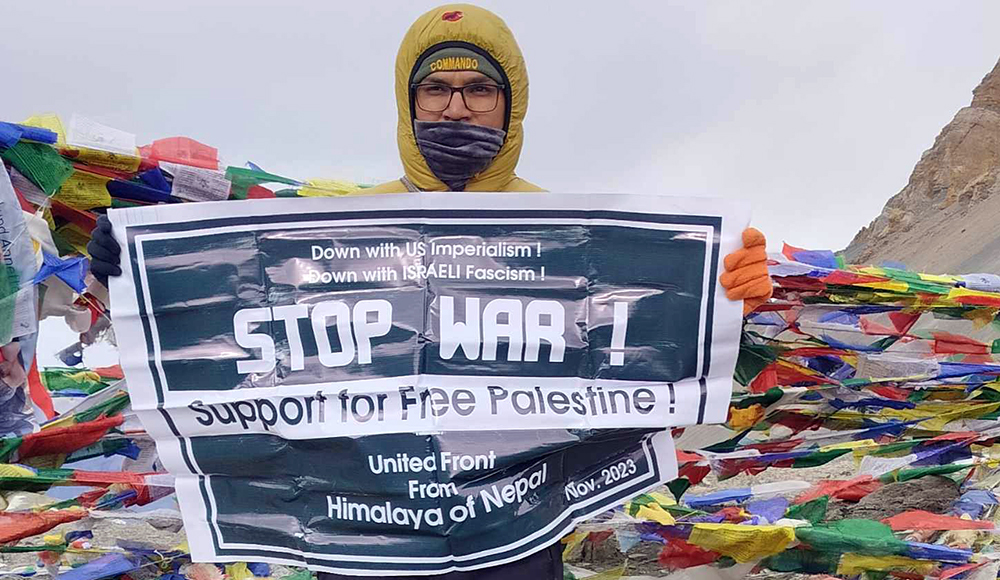 काठमाडौँ । प्यालेस्टाइनमाथि इजरायली साम्राज्यवादद्वारा थोपरिएको युद्धको विरोध गर्दै विश्वको सबैभन्दा अग्लो नाका थोरङपासमा कालो ब्यानर प्रदर्शन गरिएको छ ।