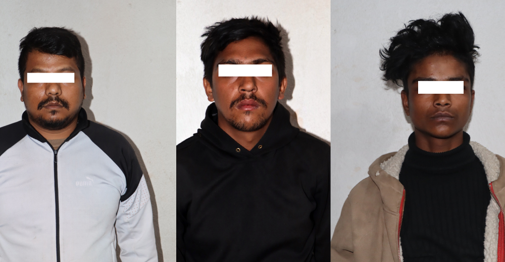 भारतको बिहार राज्य समस्तिपुर जिल्ला घर भइ काठमाडौंको तिलगंगा बस्ने २१ वर्षीय कृष्ण पोदार, भारतको मोतीहारी जिल्ला राजापुर घर भइ तिलगंगामै बस्ने १९ वर्षीय फ्रुटी भन्ने किसन गिरी र काठमाडौंको नागार्जुन नगरपालिका ६ सितापाईलाका वर्ष ३० को बिक्रम गर्तौलालाई काठमाडौं उपत्यका अपराध अनुसन्धान कार्यालयको टोलीले पक्राउ गरेको हो ।