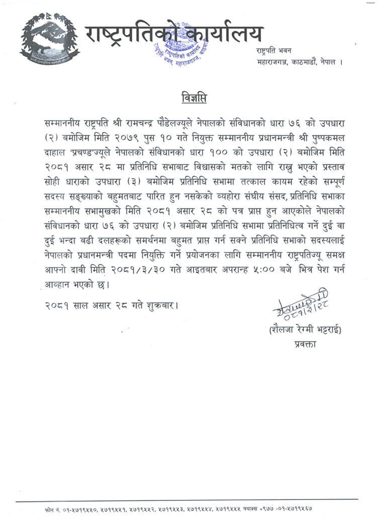 संविधानको धारा ७६ (२) अनुसार प्रतिनिधि सभाको बहुमत पुग्न सक्ने आधारसहित प्रधानमन्त्रीमा दाबी गर्न राष्ट्रपतिबाट आह्वान भएको शीतलनिवासबाट जारी सूचनामा उल्लेख छ।